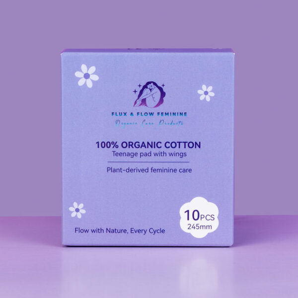 Flux & Flow Teenage Pads are made with a 100% organic cotton top sheet, gentle on growing sensitive skin.Designed to fit comfortably and support a teen ‘s changing body.